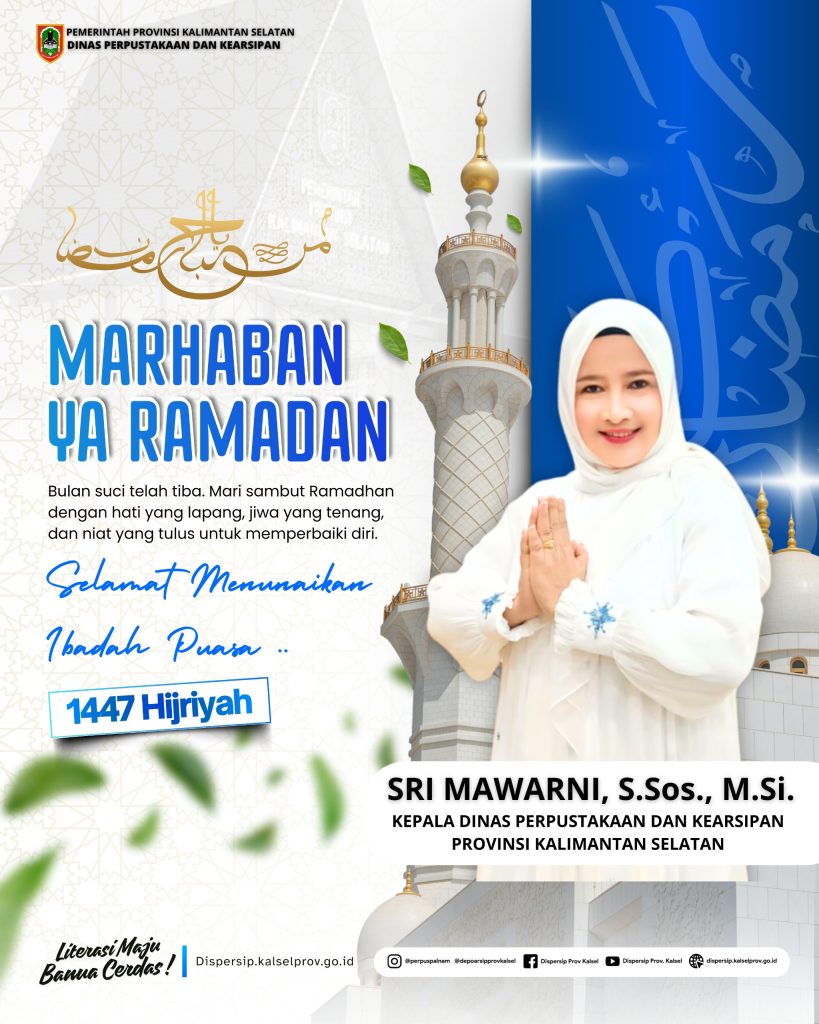 Kepala Dinas Perpustakaan dan Kearsipan (Dispersip) Provinsi Kalimantan Selatan, Sri Mawarni, menyampaikan ucapan selamat menjalankan ibadah puasa Ramadan 1447 Hijriah kepada seluruh masyarakat Kalimantan Selatan, khususnya jajaran pegawai dan mitra kerja di lingkungan Dispersip Kalsel.